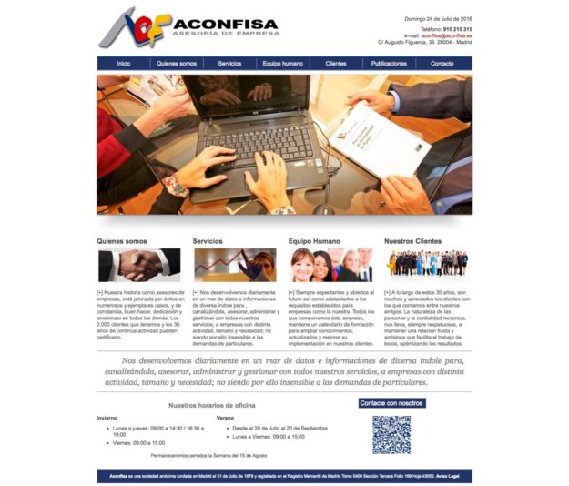 Rediseño de la web actual de ACONFISA, asesoría de empresa situada en el centro de Madrid. Traslado de contenidos a WordPress y renovación total de la imagen online.