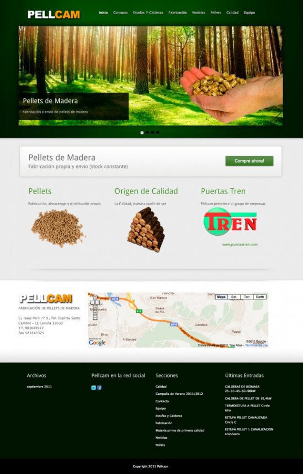 Web / Catálogo de contenido actualizable para PELLCAM, dedicada a la fabricación de pellets de madera y venta de estufas y calderas para su uso.